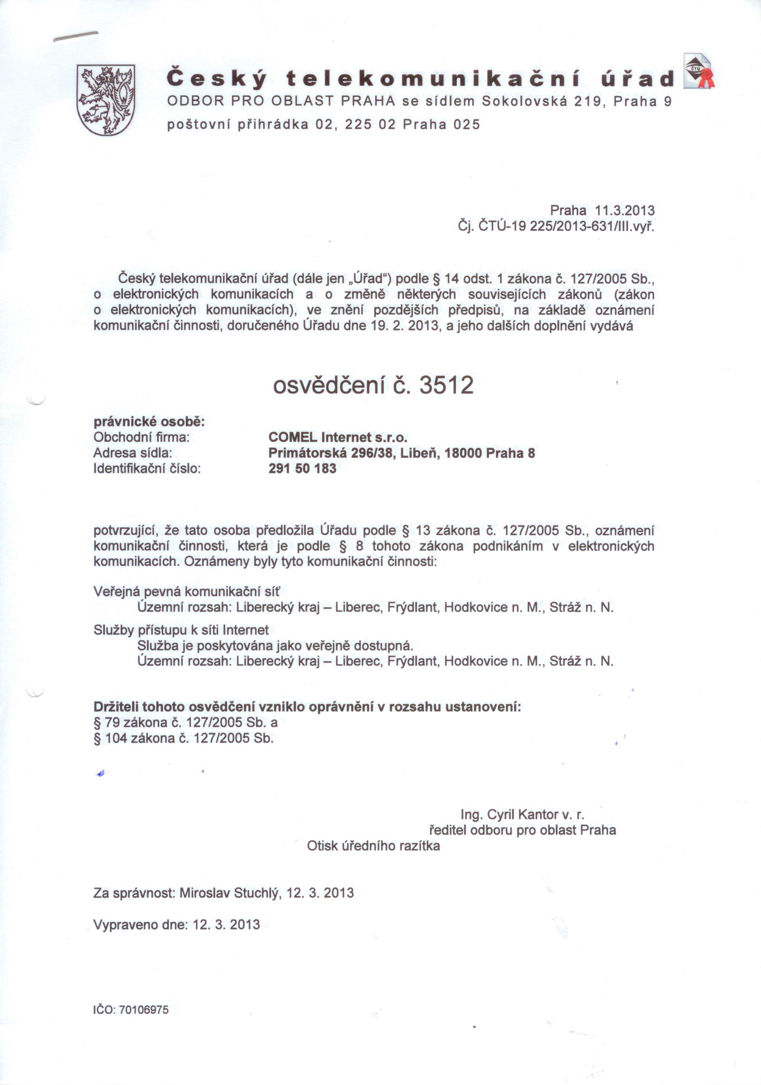 Společnost COMEL Internet s.r.o. má potřebnou registraci ČTÚ pro provozované služby a stejně tak má potřebná živnostenská oprávnění a povolení.